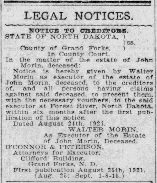 The funeral register records that his body was shipped to Forest River, N.D. [North Dakota]. John Moran’s obituary supplies a little more detail on this melancholy shipment:
