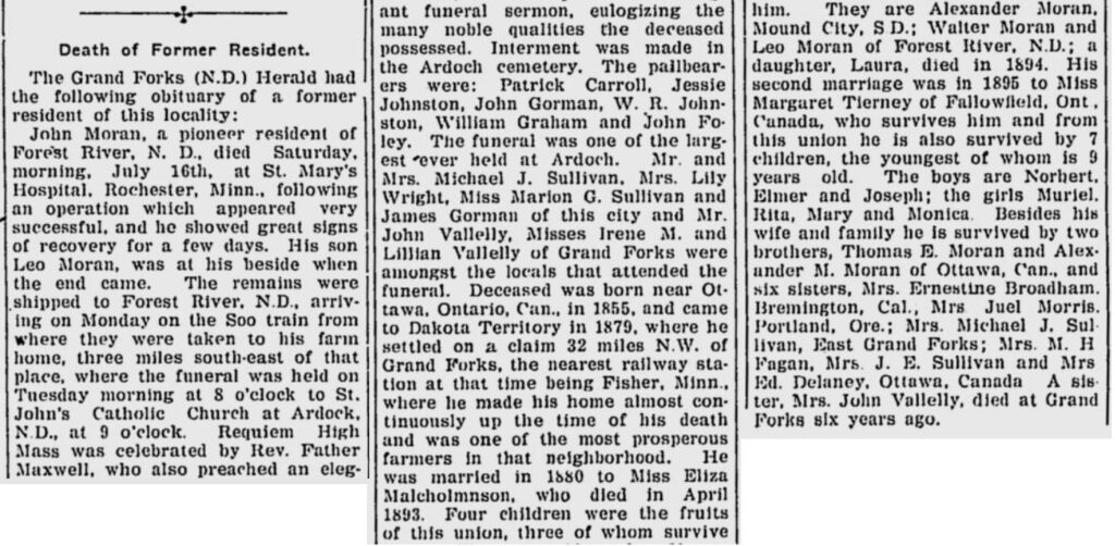 What’s interesting is that, like John Moran himself, all six of his pallbearers were emigrants to North Dakota who had been born in the Ottawa Valley area of Ontario, Canada. Patrick Carroll was born at March township, Carleton Co., Ontario; John Gorman was born at Goulbourn township, Carleton Co., Ontario; John Foley was born at Smiths Falls, Lanark Co., Ontario; and William Graham and the Johnstons came from Bell’s Corners, Nepean township, Carleton Co., Ontario. None of these pallbearers appear to be directly related to John Moran. But note that his first wife, Elizabeth Malcomson, was born at Bell’s Corners, Nepean, of Irish Protestant and Scottish Presbyterian background: might she have been connected, whether by blood or marriage, to the Johnstons and/or the Grahams?