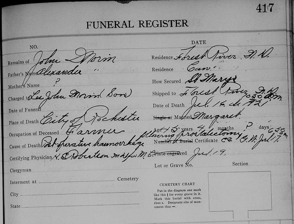 Did John Moran feel apprehensive about undergoing surgery at Saint Mary’s Hospital in Rochester, Minnesota in July 1921?1 Even before I discovered his entry in a funeral register (see below), I strongly suspected he must have done. But after reading the cause of death recorded below — Post-operative hemorrhage following prostatectomy — I now feel certain. This was a delicate and risky procedure for a 65-year-old man to undergo in 1921, and John Moran would have had every reason to fear potentially fatal complications.