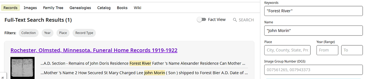This funeral home record is one of several interesting and unexpected items that I’ve recently discovered using FamilySearch’s Full Text Search. I certainly did not specifically search for a funeral home record: indeed, until I found this record, it hadn’t even occurred to me that there might be funeral record produced in Rochester, Minnesota, pertaining to John Moran of Forest River, North Dakota. Instead, I came across this record by searching for Keywords “Forest River” and Name “John Morin:”